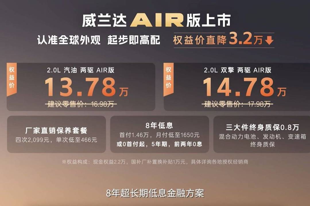 2月24日,广汽丰田全新威兰达AIR版上市,新车推出上市权益价格,2.0L汽油两驱AIR版权益价格为13.78万元,2.0L双擎两驱AIR版益价格为14.78万元。
