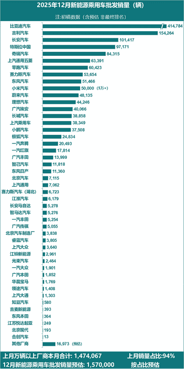 1月5日,乘联分会根据初步数据预计,2025年全年新能源乘用车累计批发量达1533万辆,同比增长25%,顺利达成“十四五”期间新能源车市增长预期;2025年12月,全国新能源乘用车厂商批发销量预估达157万辆,同比增长4%,环比小幅下降8%。